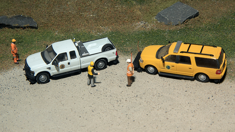 This roadside conference is one of the many small scenes on Jesse Weigand's Route87 module setup. Both vehicles are River Point Station models that Jesse has detailed. On display at the 2016 East Coast Meet in W. Springfield, MA January 30-31, 2016.