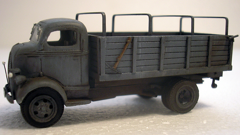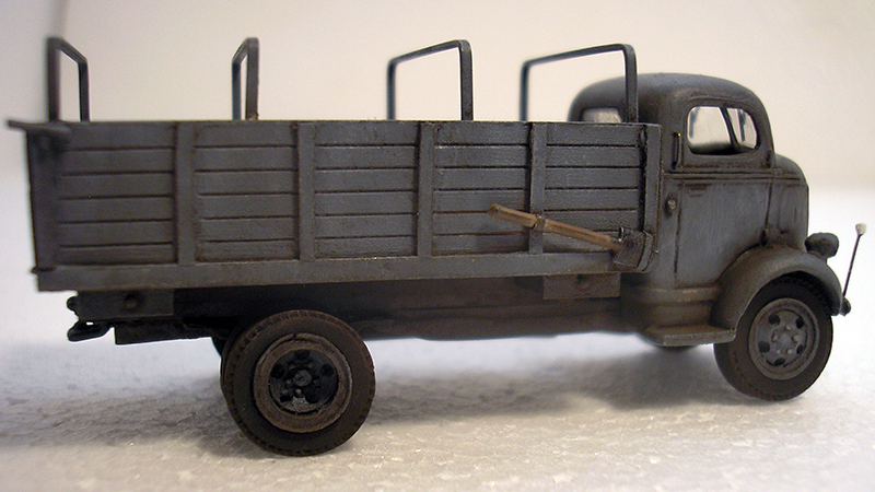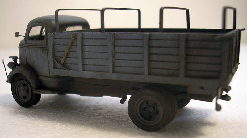 This 1943 Ford V 3000 A COE is a most unusual truck to see in German military service! A total of 758 were built in 1943-44 with all wheel drive on the 3 ton chassis. Rick Hoskinson built this model using the cargo bed from a Sylvan Scale Models 1939 Jimmy grain truck swapped out with the bed on a Sylvan 1938/39 Ford COE model. Scratchbuilt items include lollypop mirror, canvas cover bows, license plate frames, tail light housing, clearance markers, and truck exhaust system. Details added include Notek blackout lamp, pick and shovel, chassis jack, storage boxes, tow hitch, A-Line windshield wipers, and MV Products tail light lenses. Paint is Model Masters Panzer Grey with washes, dry brushing, and dry pigments applied for weathering affect. TL decals for the License plates were used.