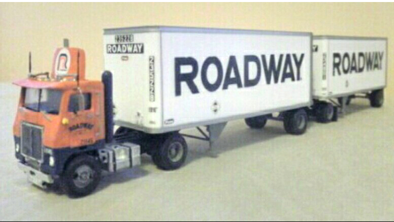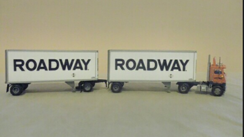 This classic Roadway Express doubles set was built using a Herpa White single axle day cab truck tractor and a set of Athearn 28' Pines trailers. Scott Kiefer added prototypical details like the vertical air tank for the air starter, turn signals mounted on the cab front corners, sun visor, and cab mounted air shield.