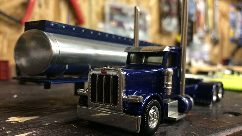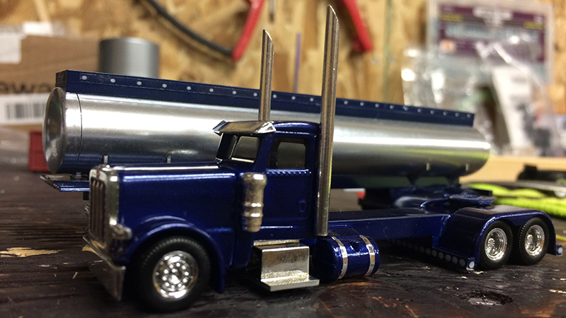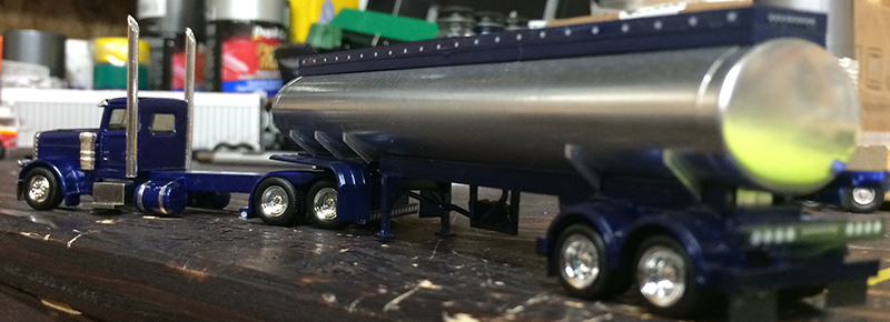 Mark Gautschi built this long wheelbase Peterbilt 389 truck tractor using a Truck N' Stuff die-cast model and lots of imagination. Both truck tractor and tanker trailer have been repainted.