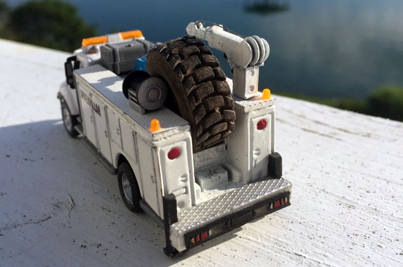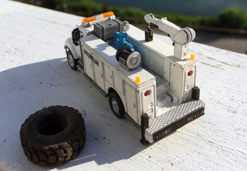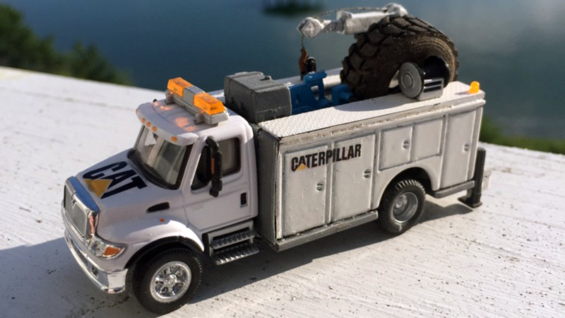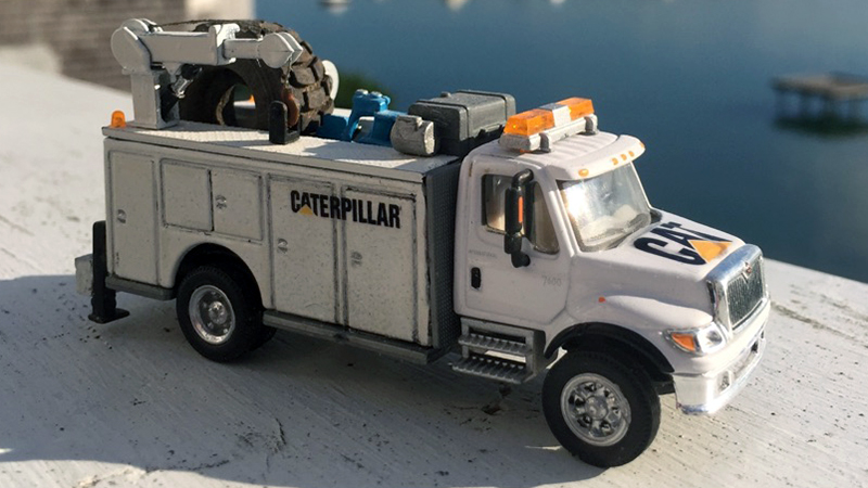 First-time contributor Alex Forman built this International 7600 Caterpillar service truck using a Boley die-cast cab, a heavily reworked Matchbox utility body, and various details from the spare parts box. The crane is from Roco and the rear bumper and stabilizers are scratchbuilt.