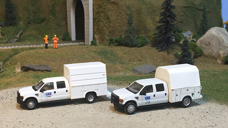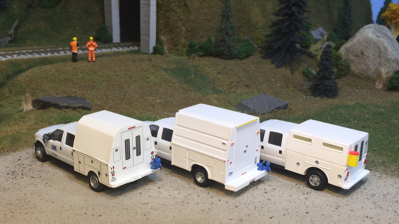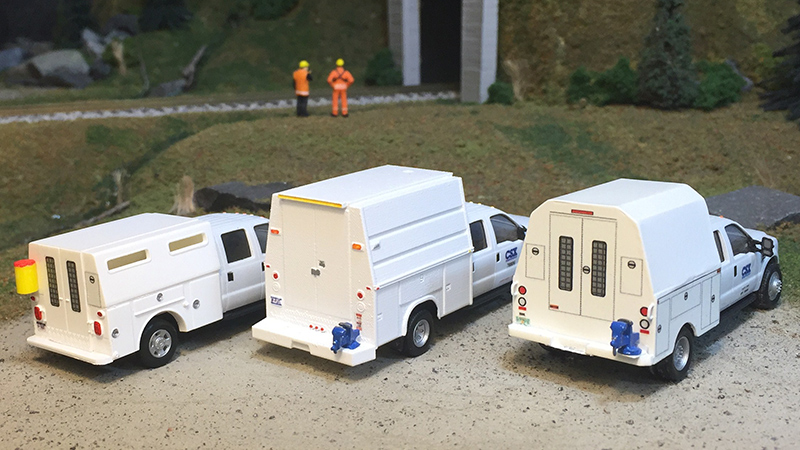 Jesse Weigand built this trio of River Point Station based CSX Transportation pickup trucks with similar walk-in service bodies. From left to right above, the truck on the left uses a Trident body with scratchbuilt top section. The middle truck's body was 3D printed and decorated to reflect a similar Knapheide service body. The model on the right has a scratchbuilt body based on Knapheide service body. Model details include custom fitted decals, handmade water cooler, and rear work vices from Herpa. Models were photographed on a Route87 module.