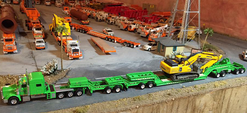 Here is Mark Kulak's latest project build using one of his Kulak Custom Kits 64 wheel lowbed kits that Mark had designed and is laser cut from styrene plastic. The truck tractor was built by Top Dog Models (Doug Musey) and Mark added more details to the model such as lights, door logos, and more chrome. The load is from Oxford Diecast and it is a 1/76 model that he weathered and cut the cab down on to look closer to 1/87 scale. The trailer is built per the kit instructions with added paper mud flaps, KCK white lights, and wide load signs. Also added were custom made company decals and tool boxes to the rear dolly. On the lowbed deck Mark added wood decking as well to complete the model.