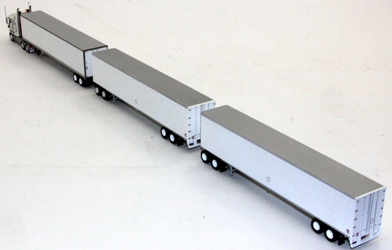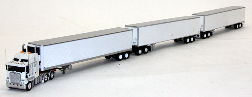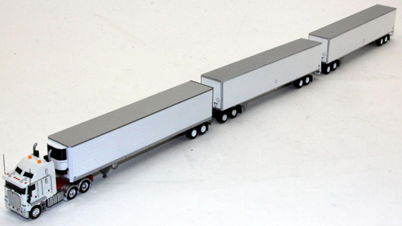 Leland Henry built this Kenworth K200 powered Australian road train for a Zycon Models customer. The project started with a Promotex resin casting of the KW K200 was heavily modified. The road train includes one Athearn Utility 53' Reefer (lead position) and two Athearn Wabash 53' dry vans. The tandem axle convertor dollies were scratchbuilt.