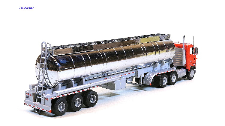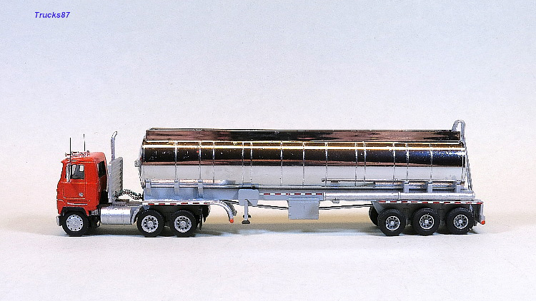 This beautiful Mack Ultraliner day cab model from Kurt Hofmeyer features a Herpa truck tractor chassis, resin cab from a mold master by Thomas Wegert (shortened), wheels by Promotex, and tires by Rietze. The trailer is from Promotex (heavily reworked) with modified wheels, also from Promotex.