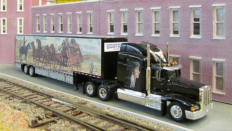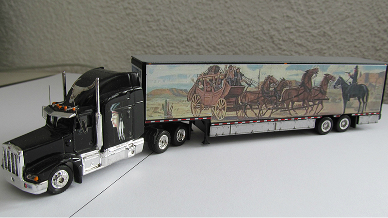 Inspired by the movie "Smokey & the Bandit," a long time ago, Bruno Zueger created this Wild West Moving rig. The model features a Peterbilt 377 truck tractor from High Speed with only mirrors from A-Line added. The moving trailer is a Promotex 48' model with an additional box on the rear. The decals are homemade from templates found on the Internet.