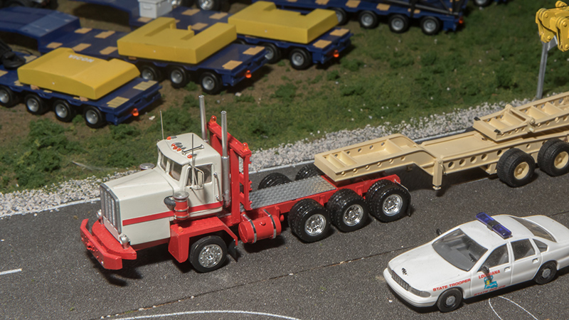 This setback axle Kenworth on display at the 2017 East Coast Meet on Thomas Kelly's Route87 module was built by the late Bob Leinbach. The Kenworth was heavily kitbashed from an Athearn Kenworth W900 to represent a setback axle C550.
