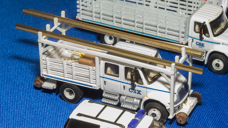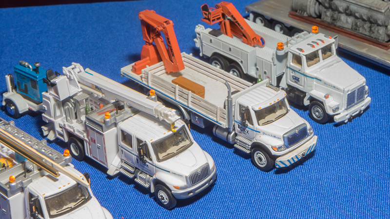 These CSX Transportation maintenance of way vehicles on display at the 2017 East Coast Meet were just part of Brad Hassler's fleet of models he brought. The International 4300 (above, left and below) and 7600 (above, center) are extensively modified Boley (now Walthers SceneMaster) models. The Western Star above, right is a Matchbox toy that has been very heavily modified.
