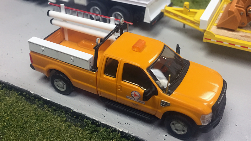 Lucas Gresham built this North Carolina DOT surveyor truck by customizing a River Point Station extended cab pickup model. It has a River Point Station side mounted tool box, custom headache rack with spot lights, and a custom warning beacon. The rack was built from styrene and the ladder is from RPS with painted sides.