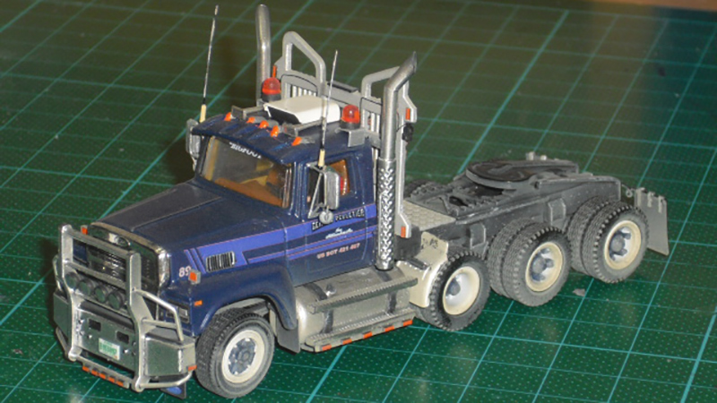 Martin Mayer built this model of a Pelletier Brothers (of American Loggers fame) logging truck tractor. The model is a Ford TLT-9000 built from a die-cast German "beer truck" model. The sleeper was removed and cab protector (headache rack), lift axle, bull bar, roof mounted A/C, and lots of additional details were added.