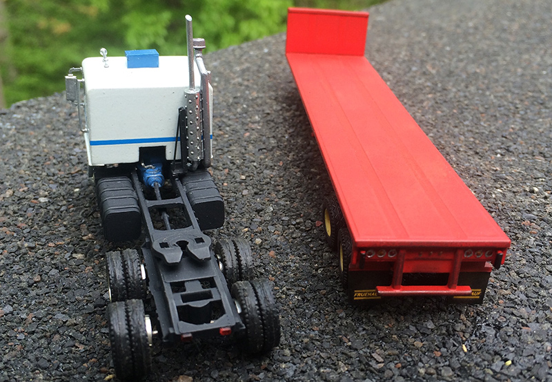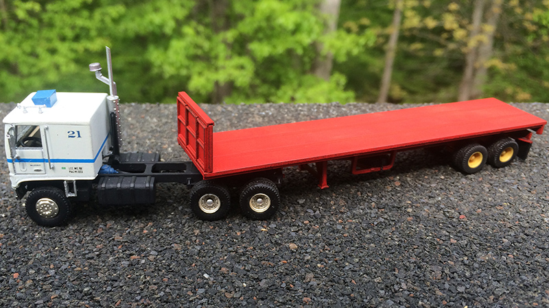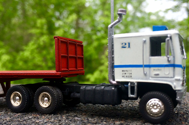 John Redding performed some spectacular magic building this mid-1970s Ford W9000. John's model started out as a 1960s Lindberg "Mini Lindy" day cab kit; John added a Plano Model Products stainless steel grille, flush mounted windshield, scratchbuilt integral sleeper, roof mount A/C unit, Athearn frame, wheels, and tires and other odds and ends from parts box. The flatbed trailer is a 40' version cut down and modified from a Promotex 53' spread axle.