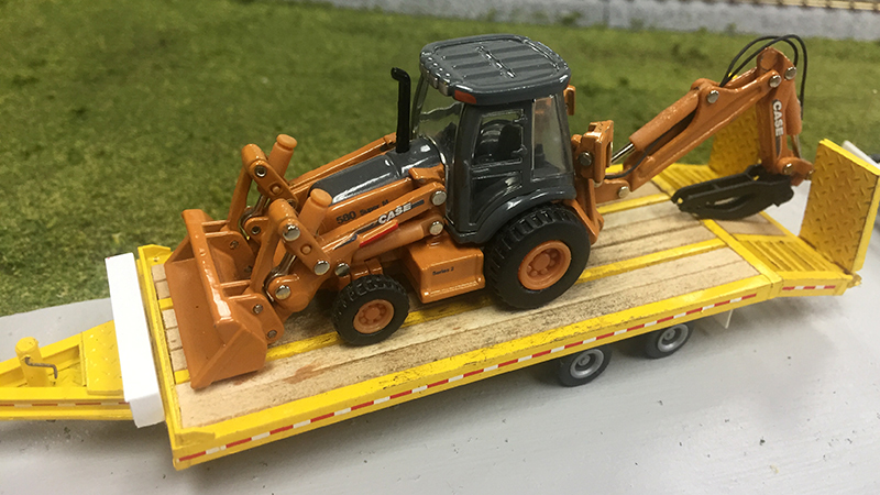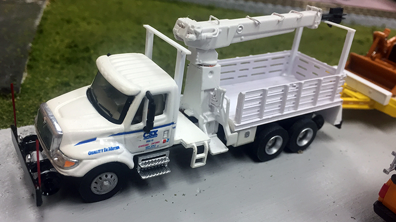 Lucas Gresham built this CSX Transportation International 7600 Hy-Rail boom truck pulling a Case 580 backhoe/loader. The CSX truck started as an orange Boley trash truck. The trash body was removed and replaced with a Boley long stake bed. The cab was repainted white. The boom is from an Athearn boom truck. Custom Hy-Rail wheels were built out of N scale train wheels and styrene . Custom made CSX decals finished the truck up.