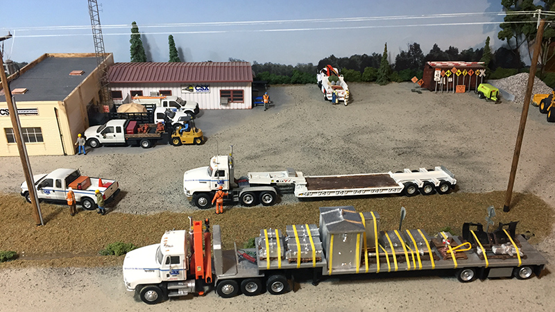 This scene is another shot of Jesse Weigand's Route87 module depicting a CSX Transportation Maintenance of Way equipment yard. Both truck tractors in this view are Herpa/Promotex models that have been significantly upgraded and detailed. The drop deck flatbed trailer in the foreground is a Promotex model loaded with railroad signal and switch equipment. The lowboy trailer above it was built from a GHQ Models pewter kit. All the light duty pickups were built using River Point Station's excellent kits (no longer offered). The yellow forklift was also built from a GHQ kit.
