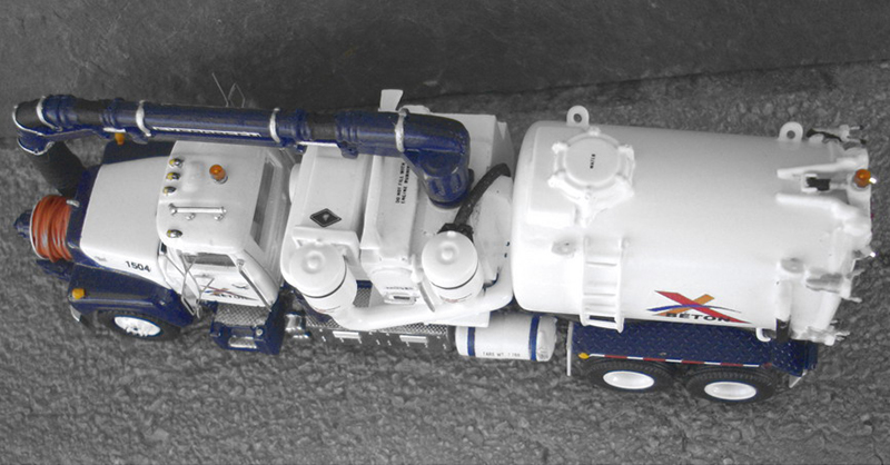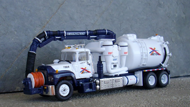 André Giroux recently built this Mack R vacuum truck utilizing the cab from an Athearn Mack R model. The frame is a modified Promotex product with wheels from A-Line and mirrors by Plano Model Products. The tank and the vacuum kit are "scrap-built" with a lot of parts from the spares box.