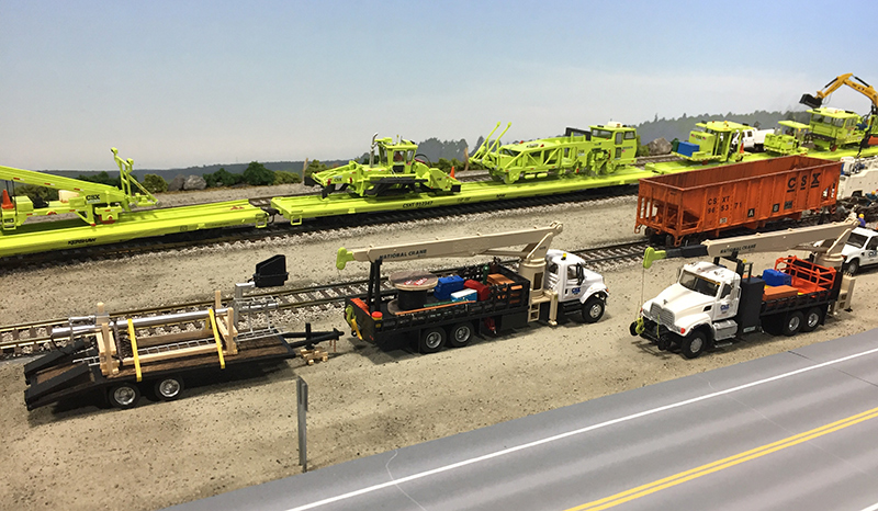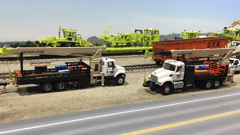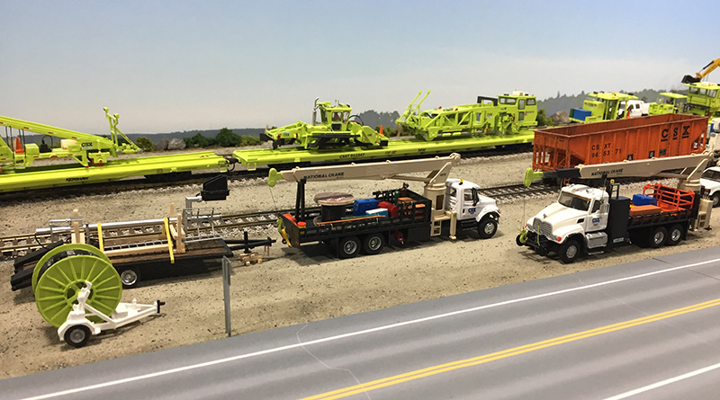 Jesse Weigand built this pair of CSX boom trucks this past summer and finally got to take some pictures on his new Route87 module. The boom trucks feature 3D printed functional booms and scratchbuilt beds. One, on the left in all these photos, has a Boley International 7600 cab and the other features a Masterbilt Models Mack Granite resin cab. The Mack features high rail gear and a 3D printed man basket. The cable spool and its trailer are also 3D printed. The 25 ton tag trailer is also a 3D print with a BLMA block signal as its load. These trucks and trailers are a common sight trackside as railroads upgrade to positive train control.