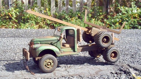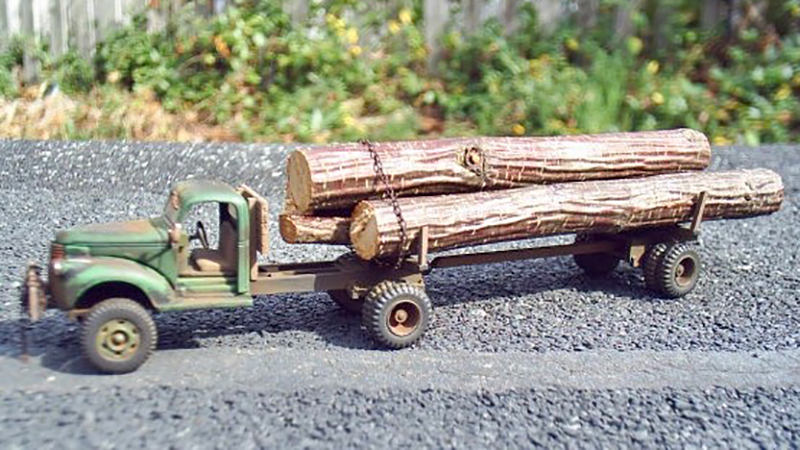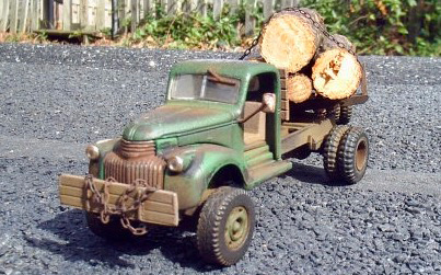 John Redding built this 1941 Chevrolet logging truck using a Classic Metal Works Chevrolet cab mounted on an Athearn frame with CMW front wheels and Roco rear wheels. The scratchbuilt trailer also has Roco wheels. Old time loggers would take the doors off their trucks so that could jump clear if the brakes went out.