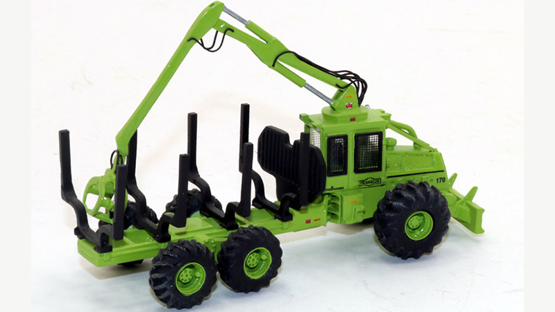 This Franklin 170 six wheel pulp/log forwarder was built by renowned model builder Leland Henry. Starting with a Resin Unlimited #202 Pulpwood Forwarder resin kit, Leland built the replica adding details including hydraulic lines, special photo-etch window screens (instead of the nylon mesh that came with the kit), and even the tiny exhaust pipe tip. A lot of work was done on the resin parts, a process that included filing, sanding, and putty work to make sure all the castings were smooth prior to painting. The detail level is exceptional. The model was custom painted then decorated with special Franklin Tree Farmer 170 water slide decals made by Zycon Models.