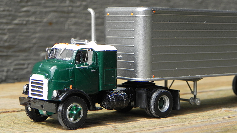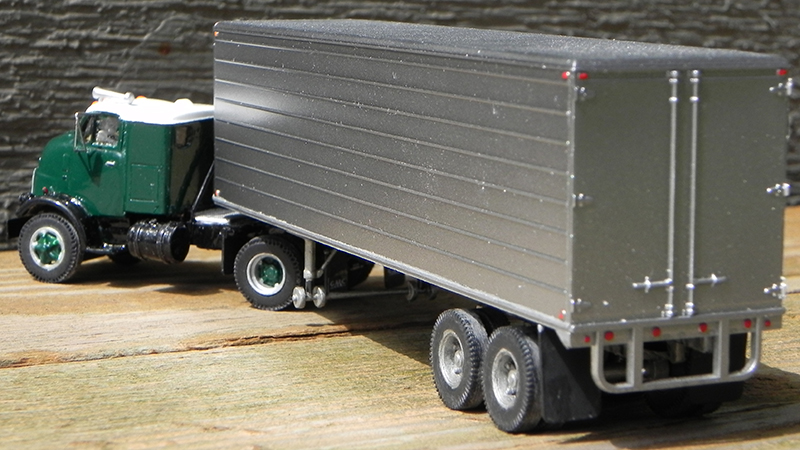 Here is the latest project off Jim Groeneweg's workbench, utilizing Walthers' 35’ trailer pretty much out of the box. Jim added mud flaps and a coat of Alclad Polished Aluminum. The truck tractor is of course the awesome Sylvan Scale Models kit. It is mounted on an unknown Herpa European truck chassis that was modified to accept the cab. The fuel tanks were cut off the supplied chassis and grafted on with added deck plate, scratchbuilt bumper, exhaust and bracket with Athearn air horns. Wheels are five spoke Athearn using the Sylvan tires and interior, mirrors. The paint is '55 GM commercial green with white base/clear paint with the fenders painted in Humbrol black later. You can see details of the entire build process on Hank's Truck Forum.