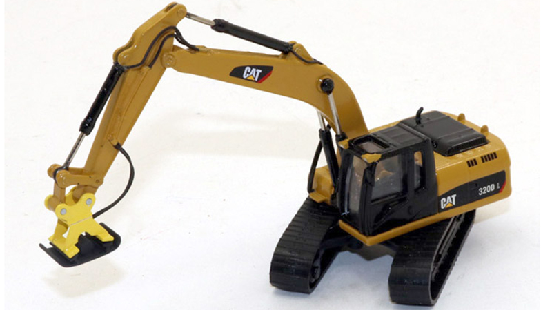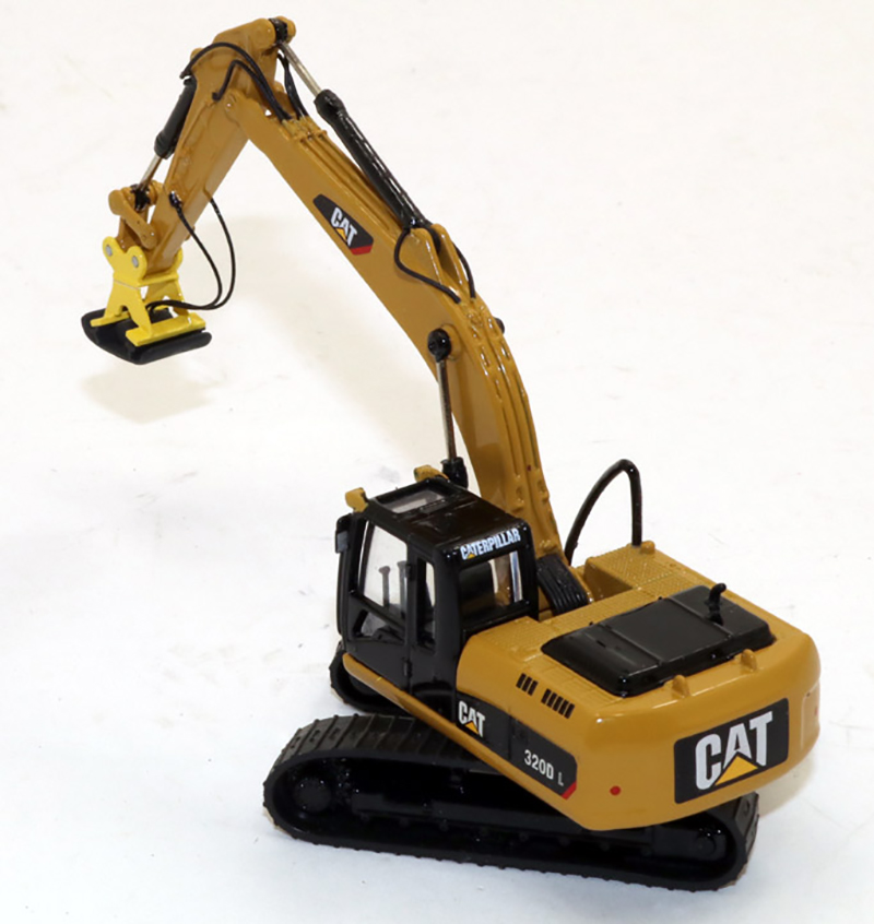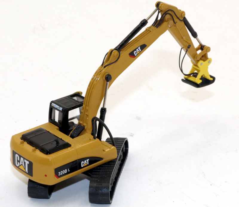 Leland Henry built this custom Cat 320D L with tamper attachment. The model features a scratchbuilt tamper attachment and hydraulic line/hose treatment. Leland started with a Diecast Masters Caterpillar model.