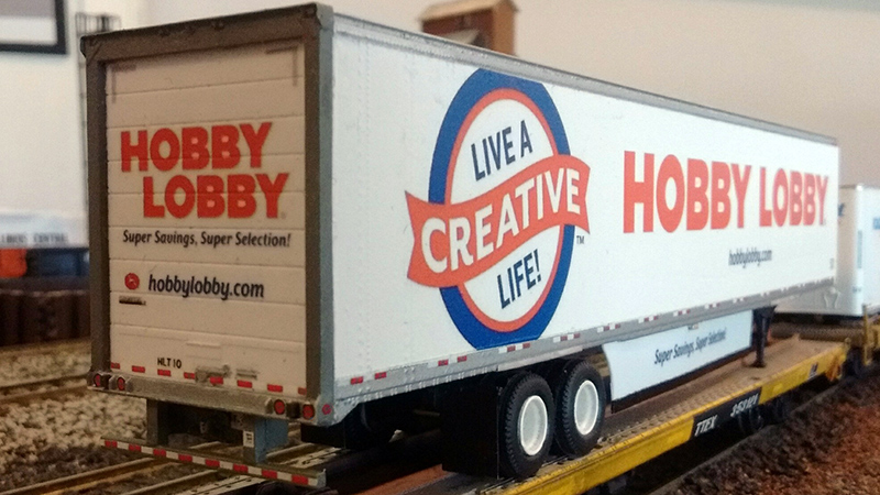 Dale Henigman used a Walthers 53' Stoughton trailer kit to build this Hobby Lobby trailer. Dale used Athearn wheels on this model. The artwork for the decals was done in Microsoft Paint and Microsoft Publisher at Dale's local library. Dale used a belt sander to sand off the swing doors and then installed an A-Line roll up door. Safety decals and stripes were hand drawn for the decals. The pintle hitch assembly was fabricated from .015" wire; these trailers can operate as turnpike doubles. Lifting pad/runners were made from soda can aluminum stock.
