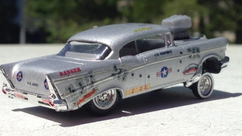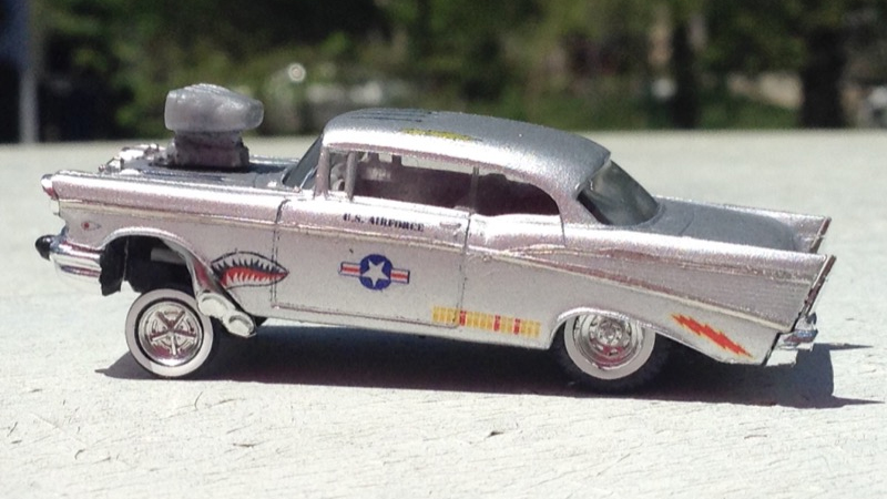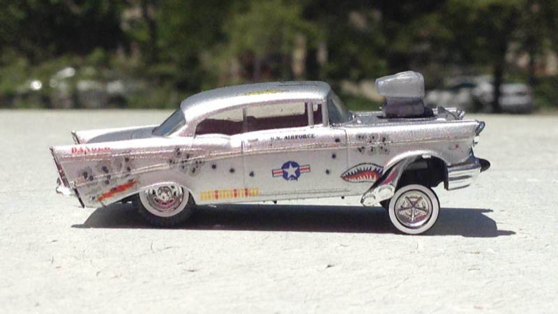 This 1957 Chevy Bel Air began as a Busch model in stock trim. Samuel Denehy rebuilt is as a "gasser" drag racer. Samuel took it all apart, repainted it flat sliver, added Bare Metal Foil to all the trim, and covered the car in war decals. He altered the front and rear suspension, put some beefy rear wheels under it, added some skinny cookie cutter wheels on the front, and made some custom leaf springs for the front. Samuel put a huge blower motor in it with some "crazy" exhaust coming from under the front fenders.