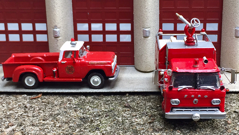 John DaPos built this 1959 Ford C-600 hose tender (above and below, right) was built using an old Revell cab with an EKO body. The 1959 Ford pickup was made using Classic Metal Works models. Both units were heavily modified and detailed. These models were previewed in Photo Gallery 717.