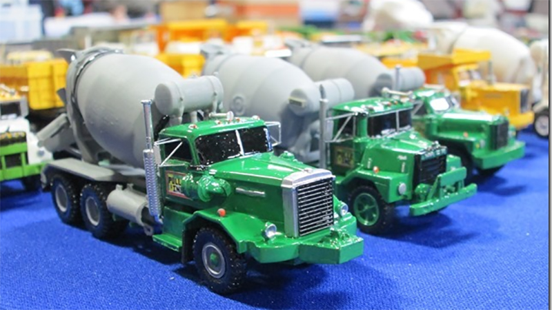 The late Bob Pullen built this fleet of concrete mixers using an Alloy Forms Autocar Construcktor white metal cab (left), a Ralph Ratcliffe Models resin Mack DM600 (center), and a Don Mills Models Mack B875 resin kit. The mixer bodies are from various sources. Photographed by Brad Hassler at one of the 1/87 Vehicle Club's East Coast Meets in West Springfield, Massachusetts.