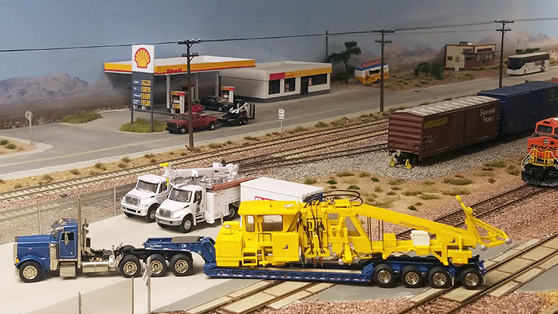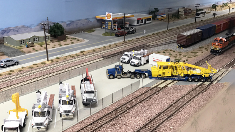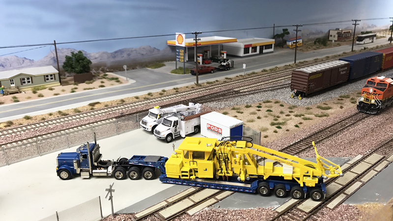 This Pandrol Jackson 6700 production tamper was built by James Kocher from one of his own Custom Finishing Models pewter kits. The model is shown here loaded on a Classic Mint Collectibles brass Talbert four axle lowboy trailer pulled by a Classic Mint four axle Peterbilt 379 truck tractor. The International MoW trucks in the fenced lot are all customized Boley models; the lone Freightliner FL70 was built using a RMM resin crew cab mounted on a Boley chassis. Photographed on James' model railroad.