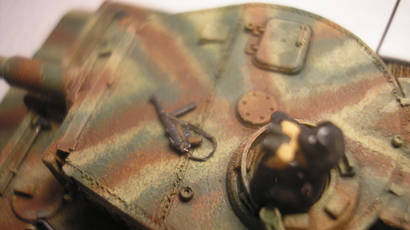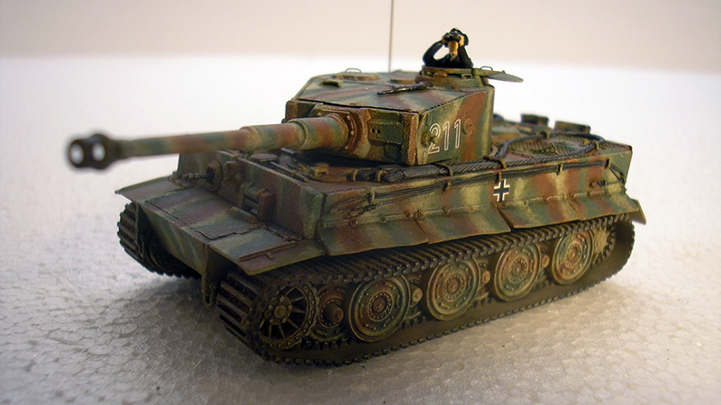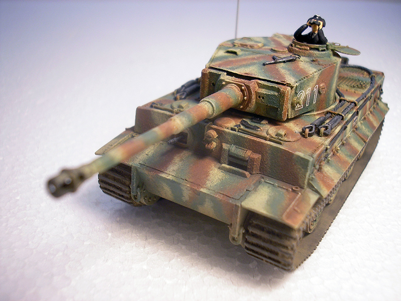 This late version of the of the vaunted Tiger World War II military tank has been heavily detailed by Rick Hoskinson with scratchbuilt tow cables from fine twisted wire, engine compartment intake screens, automotive glazing putty applied to turret roof and to hull deck where it joins with the sides and then tooled to represent weld beads. Grab handles were installed on gunner's hatch, commander's hatch, and engine cover hatch. A rain guard was made from wine bottle foil and installed on the turret roof behind the gun mantle. The antenna was turned from brass rod. The commander's cupola was coated with Mr. Surfacer 1000 and stippled to get the cast armor appearance. The molded-in track install cable on the left side of the hull was scraped off and a fine wire one was made and hung from flat brass angles. The driver's visor was improved by adding 35 mm film negative to simulate armored glass. The headlight has an armored wire conduit from .010 brass. Nut, bolt, and washer detail parts from Detail Associates were used on the mud guards and the exhaust stack weather caps are also Detail Associate parts. Paint is Model Masters in late war three color scheme. The tracks were painted in buffing metalizer and then coated with latex matte media and dusted with dry pigments. Decals are from TL and the figure is from Preiser. The MP40 submachine gun on the turret roof (bottom two photos) is also from Preiser and its sling is from wine bottle foil.
