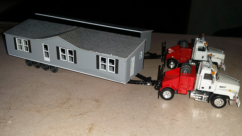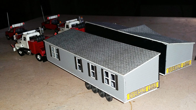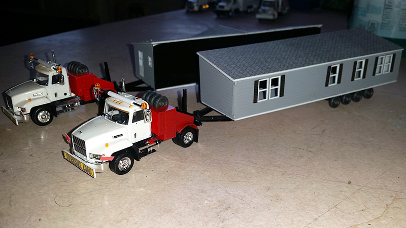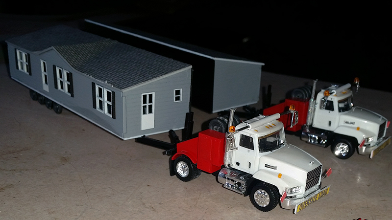 Lacy Brown built this pair of Mack CH mobile home "toter" trucks using Promotex/Herpa Mack CH models cut down to a single driver axle configuration. The bodies were scratchbuilt and hold spare tires for the trailers and other details. Each truck is outfitted with a full complement of safety and warning signage and lights. The mobile home sections are from an unknown source.