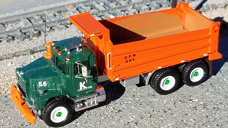 Bev Fitzpatrick built this steel nose Mack DM600 dump truck using a Ralph Ratcliffe Models resin cab, Herpa/Promotex Mack CH chassis, and dump body from an unknown source.