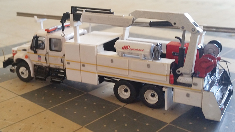 Lacy Brown built this Union Pacific International 4400 crew cab maintenance of way truck using a Walthers SceneMaster/Boley die-cast cab mounted on an extended chassis and scratchbuilt body with tons of additional details.
