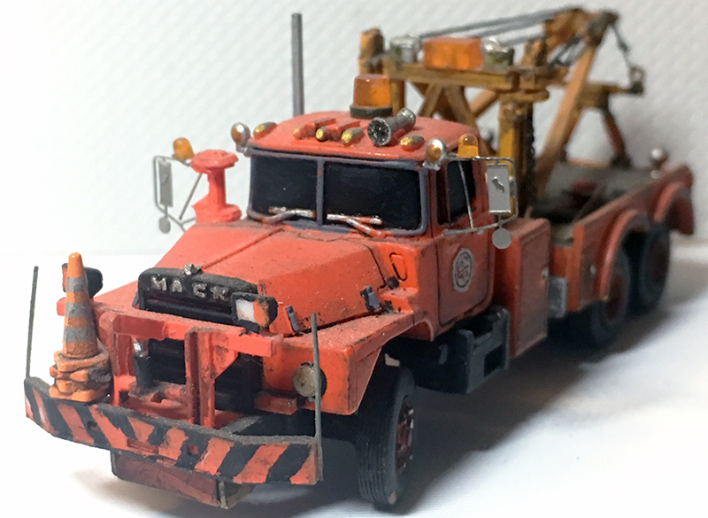 This Mack DM600 tow truck from Brian Donato was built using a Ralph Ratcliffe Models resin cab, chassis kit, wheels, and snow plow setup with an Athearn tow truck body. Features include photo-etched mirrors, Roco strobe lights, Custom Finishing tool box, a stack of Boley traffic cones, Athearn cab mounted spotlights from a fire truck model, and beading wire for bumper posts. This would be used by a highway department to rescue broken down plow trucks; that's why it has a plow setup up on the front so they can hook up the plow and tow the truck back to the garage. Brian used brushed on weathering powders to give it that workhorse look.