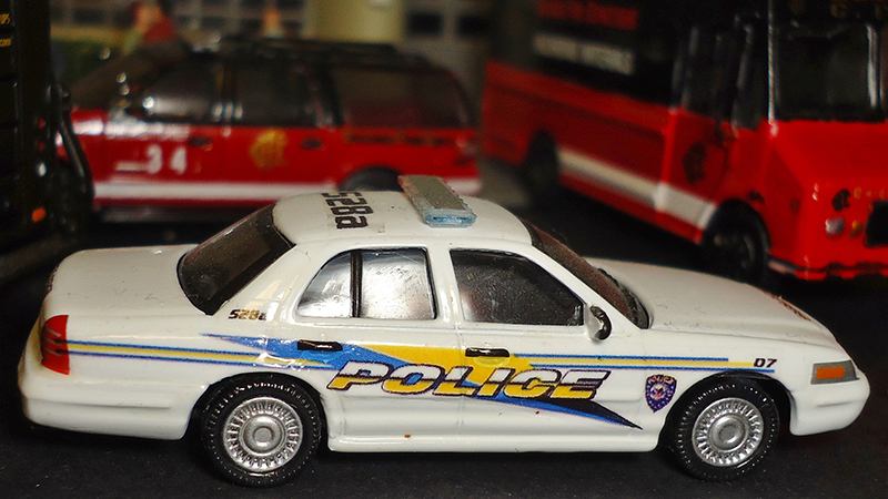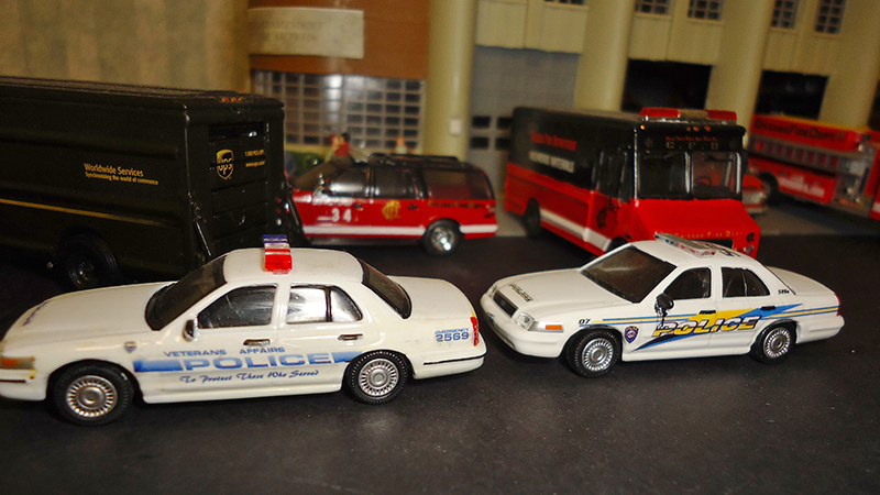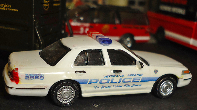 These Ford Crown Victoria models display two distinct schemes used by the United States Veterans Affairs Police. Jim Brown used Model Power die-cast models with his own custom decals.