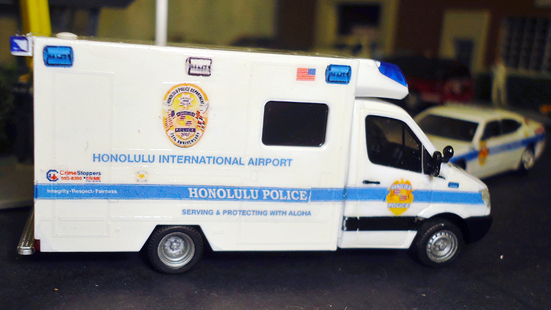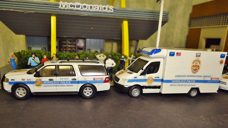 Jim Brown built this Honolulu (Hawaii) Police Department airport security operations support truck using a Herpa Mercedes Benz Sprinter van. Jim used a River Point Station Ford Expedition for the vehicle in the bottom photo.
