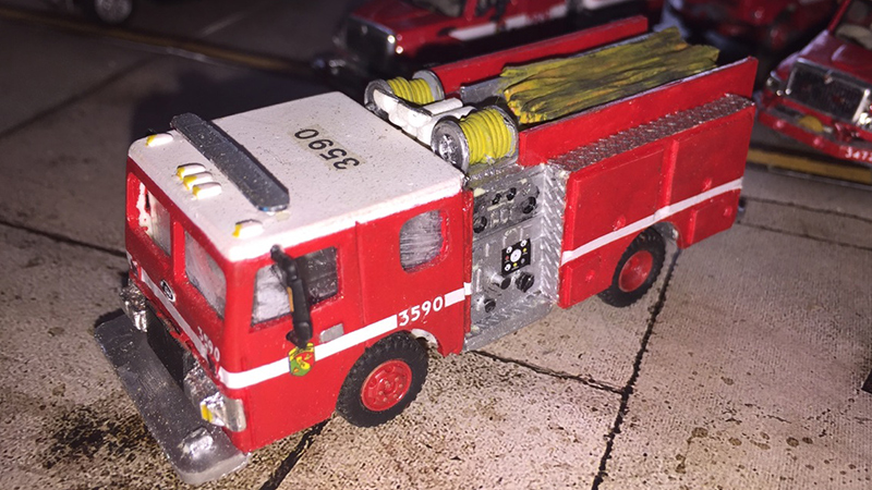 At bottom is Engine 3590. This is a Cal Fire Model 19 from Beaumont, CA. Alex built this model about 10 years ago from a Puget Sound Castings kit. The hose bed over the pumps has been modified to hold reels and there are painted and weathered "hoses" on top of the rear section (made from rubber bands). Flood lights (3D printed) have also been installed between the hose reels. The light bar is from River Point Station and the Puget Sound wheels were replaced with wheels from Roco.