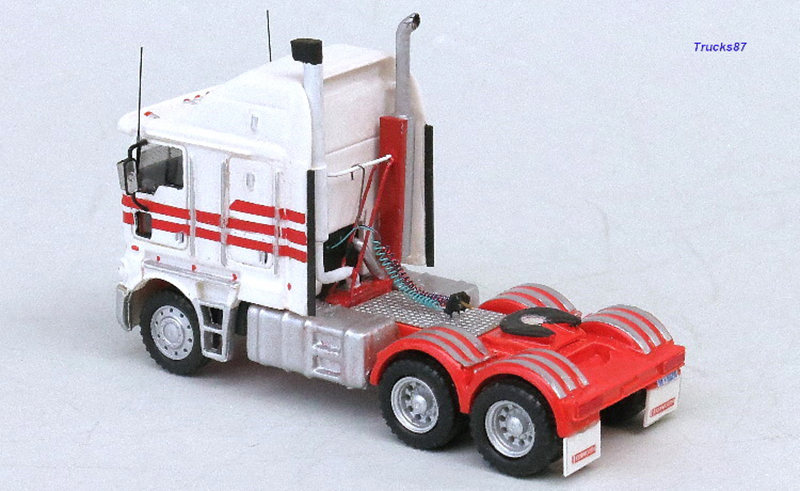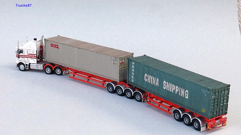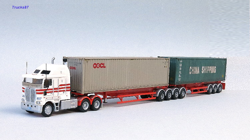 Kurt Hofmeyer built this Australian Kenworth K200 B-Double container transporter. The truck tractor was built from a resin kit by Gunter's Car Company (Germany), the trailers are by DecalPrint with modified wheels from Promotex, the containers are from Walthers.