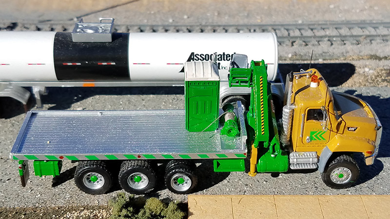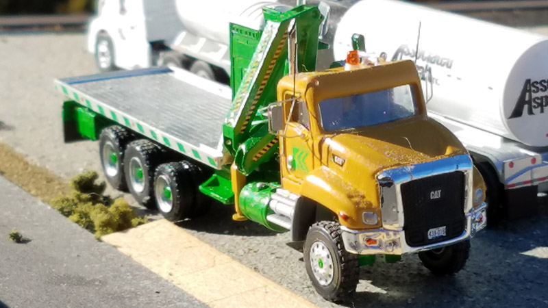 Bev Fitzpatrick built this Cat CT660 flatbed using a Daron cement mixer die-cast cab mounted on a Promotex builder's chassis. The winch bed was kitbashed and outfitted with a Herpa knuckleboom crane. Additional details include Athearn fuel tanks, Herpa exhaust stack and horn, and mirrors are A-Line. Decals on the bed are from Microscale and decals on the truck are custom Microscale for Kapital Construction Corp.