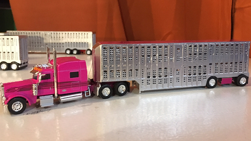 This Peterbilt 389 truck tractor and 50' spread axle livestock trailer were built by Mark Kulak. The Peterbilt is an off the shelf die-cast Trucks N' Stuff model. The spread axle livestock trailer was built from one of Mark's own Kulak Custom Kits laser cut styrene kits. The spread axle variant of one of five different variations of the livestock trailer kits.