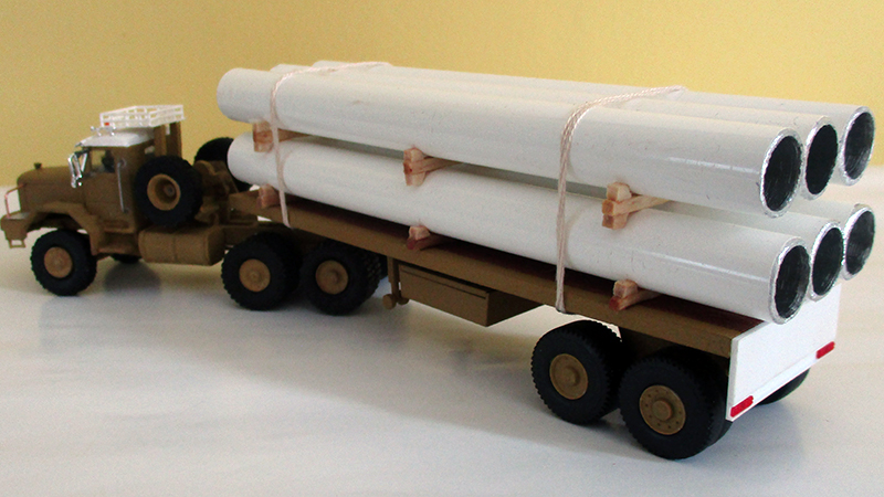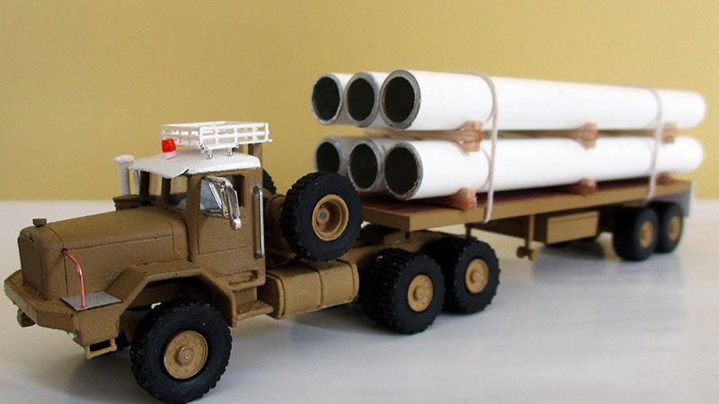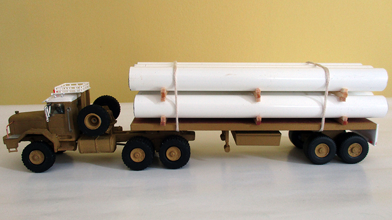 Jan Romijn submitted these photos of his Berliet T 100 truck tractor built from a resin kit from Wreckmodels Canada. The trailer Jan made himself and the pipe load was built from an old curtain rod. As always, a lot of parts are from the spare parts box. Jan modified the truck tractor with Kibri wheels.
