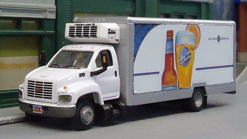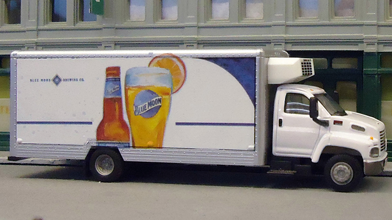 Bruno Zueger built this Blue Moon beverage delivery truck using a Herpa small moving truck that originally had an International S1900 Cab. Bruno changed the cab with one from a GMC Top Kick model from Boley and added the refrigeration unit from AWM. The decals are produced by Bruno's grandson, Kai.