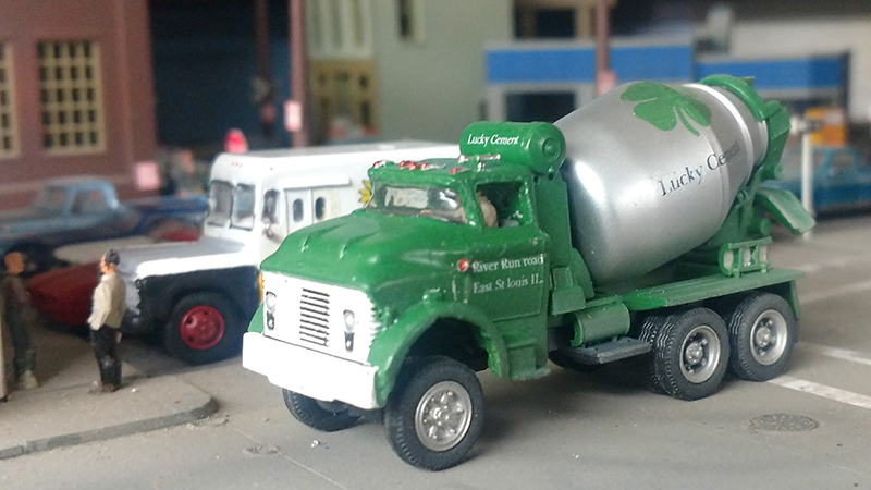 This GMC B-7000 cab was shrunk down from a Matchbox K4 larger scale model. The resin cab is mounted on a Boley cement mixer chassis. The water tank is a rebuilt A-Line fuel tank and the model has custom decals.