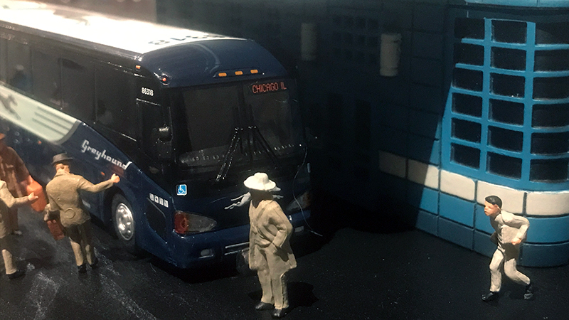 This Greyhound Lines MCI G4500 motor coach and bus station depicting a scene in Chicago, Illinois. The bus is an Awesome Diecast model.