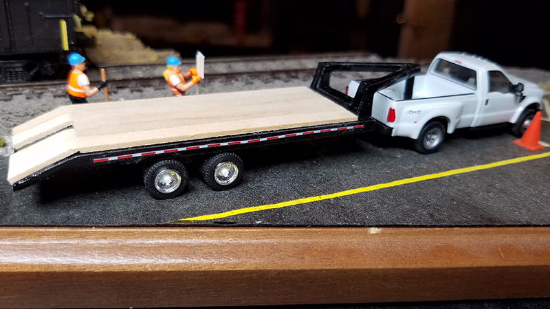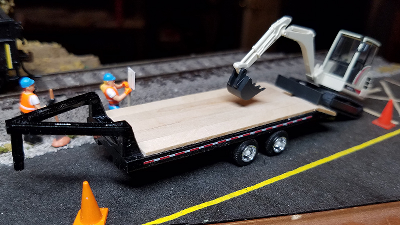 Dana Stratton printed these gooseneck utility trailers on his 3D printer because there were no units for sale he could find. The trailer was finished with a real wood deck and is shown being pulled by a River Point Station Ford F-450 truck and towing a Wiking Terex mini-excavator in the photo above.