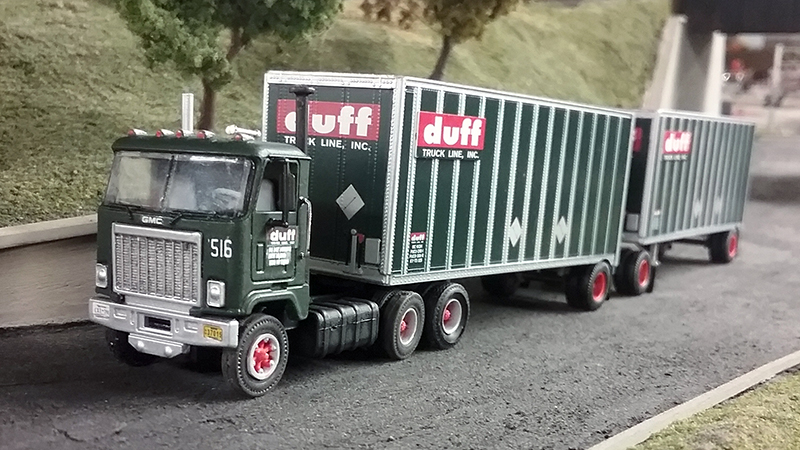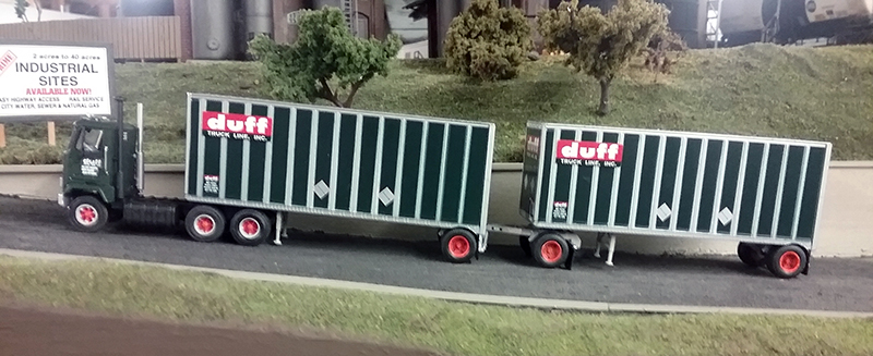 Brad Hassler assembled this Duff Truck Line GMC Astro and pair of 28' doubles trailers using a Lindberg Astro day cab outfitted with Athearn wheels and tires and mated to a pair of Athearn 28' exterior post trailers.