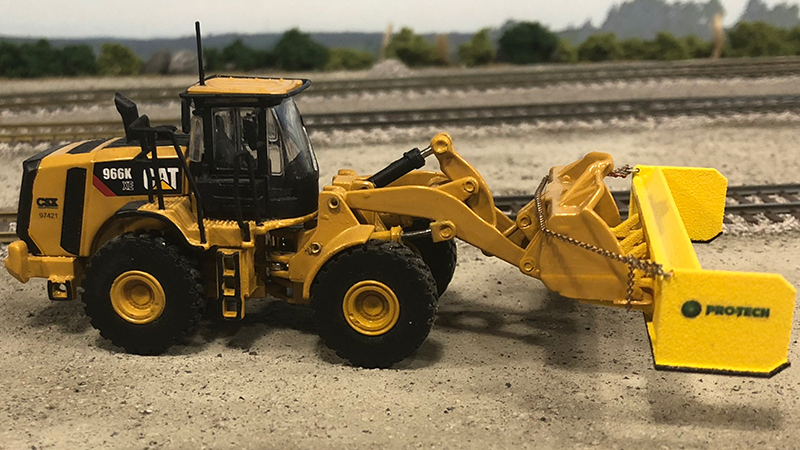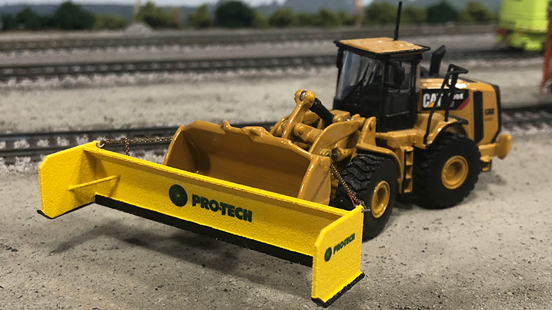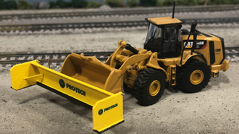 This CSX snow pusher is waiting for the storm to hit. This model from Jesse Weigand started as a Norscot Caterpillar 966 wheel loader and was modified with a a 3D printed snow pusher and decals. Rigging has been added to make the temporary attachment of the pusher to the loader bucket.