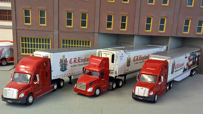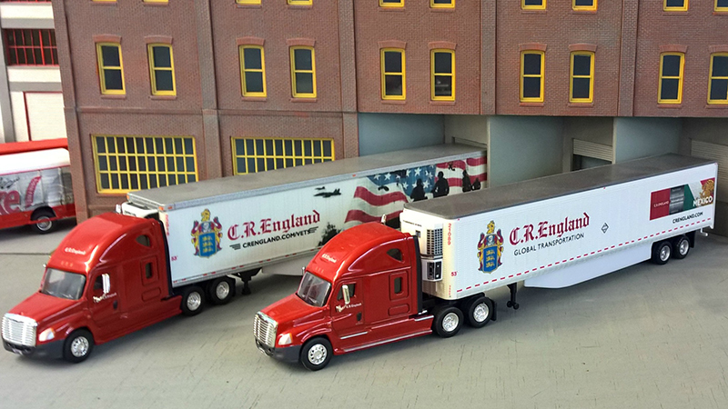 Bruno Zueger submitted these photos of his C.R. England truck fleet. The "Mexico" trailer (below, right) is Bruno's second variation of an R.C. England reefer truck. Now both of the trailers have numbers and the front bumpers of the Freightliner Columbia truck tractors are prototypically dark gray. The tractors are from Trucks N' Stuff, the trailers from Promotex. Bruno decorated the trailer with homemade decals.