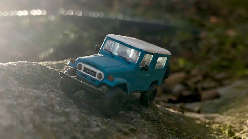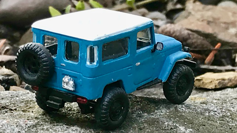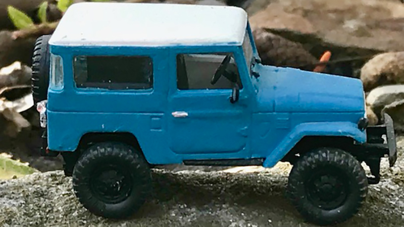 This Toyota FJ40 is a model of an actual vehicle John DaPos owns. It is a Busch model that has been lifted and now has 35 inch tires. Wheels and tires are from Roco.