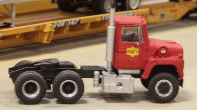 This Missouri-Kansas-Texas Railroad ("Katy") piggyback rig was built by Bob Johnson using an Atlas Ford LNT-9000 tandem axle truck tractor and a Trainworx 40' Brown trailer. The Atlas model has received extensive upgrades; Plano Model Products photo-etched grille and mirrors, Athearn spoke wheels (stripped and repainted) and tires, painted fuel tanks, and decals. The tractor decals are from a Microscale N scale locomotive decal set and the tractor received a coat of Dullcoat for a prototypical sun-baked red appearance. Photographed on the club layout of the Texas Northern Model Railroad Club in Plano, Texas. The rig is now part of the collection of club president, Larry Breedlove.