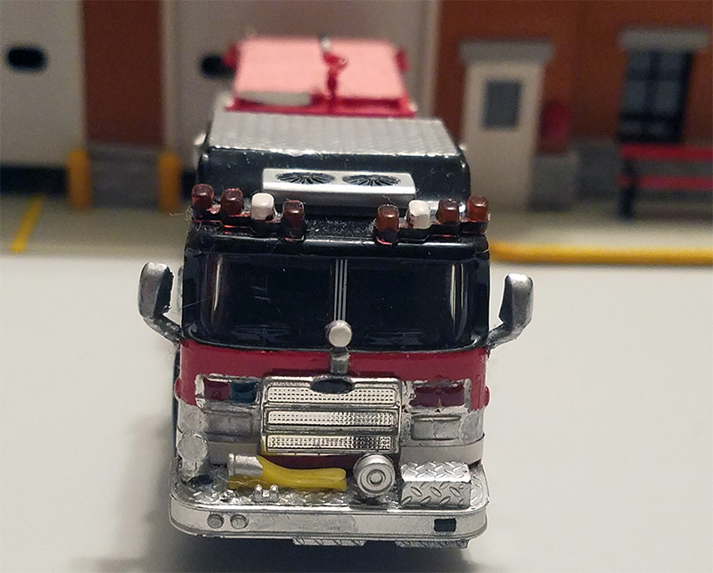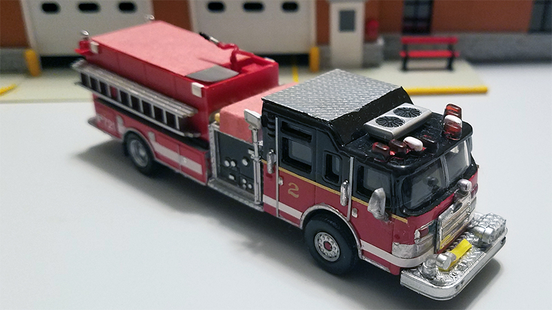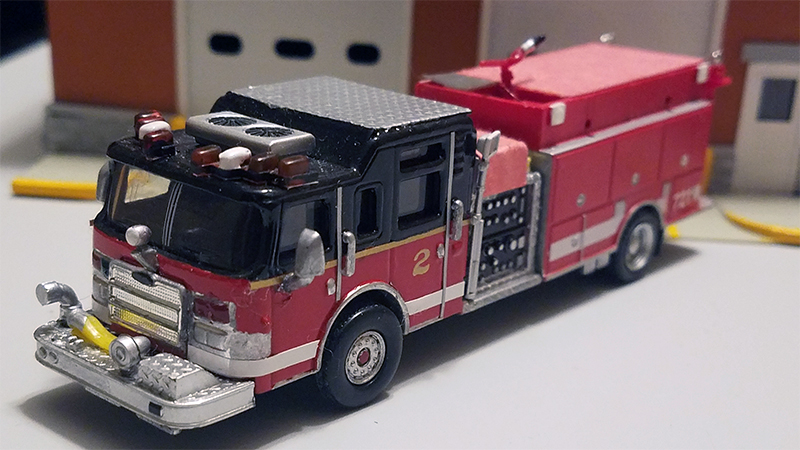Keith Grzadziel built this 2007 Pierce Dash fire pumper. He utilized a Boley pumper body and chassis and married it to half of a Del Prado Pierce quint. Fresh paint, white model airplane striping, dry transfer numbers, along with many custom details and accessories completed the transformation. Hose bed covers are made of construction paper. Boley supplied the hoses and deck gun. Q siren, tripod flood lights, and AC unit are from Del Prado. Other details include an Athearn 888 light, Matchbox custom light bars, and grille from the Matchbox Pierce Velocity tower ladder.